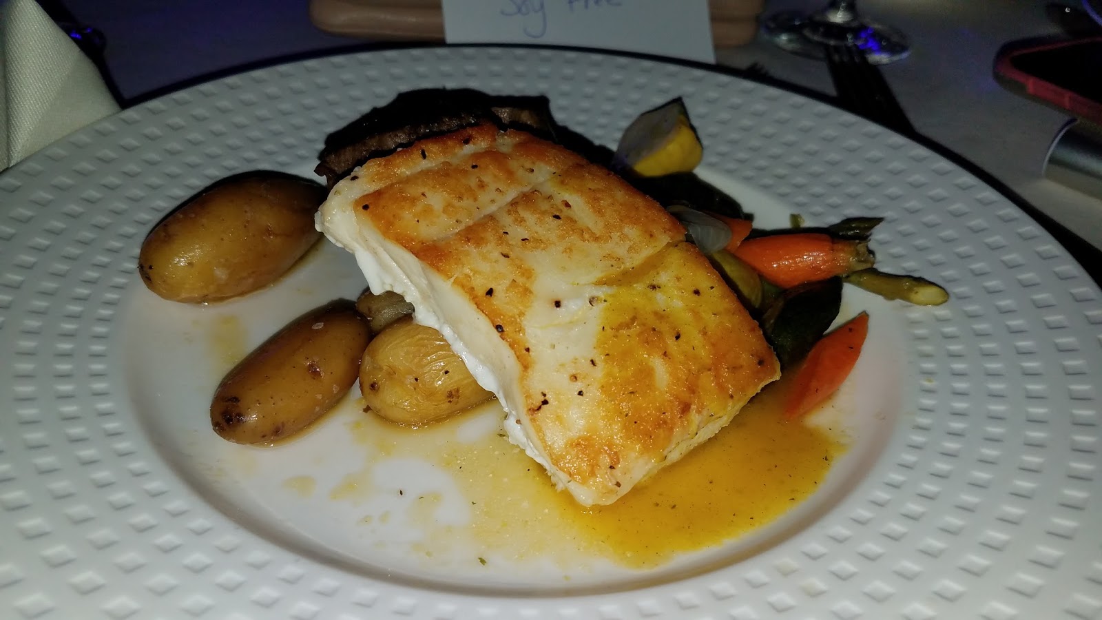 Dinner was hilarious. I let the catering staff at the table know I was gluten free. I didn't feel I was understood. I wrote on the back of the printed menu, "Gluten Free and Soy Free".
